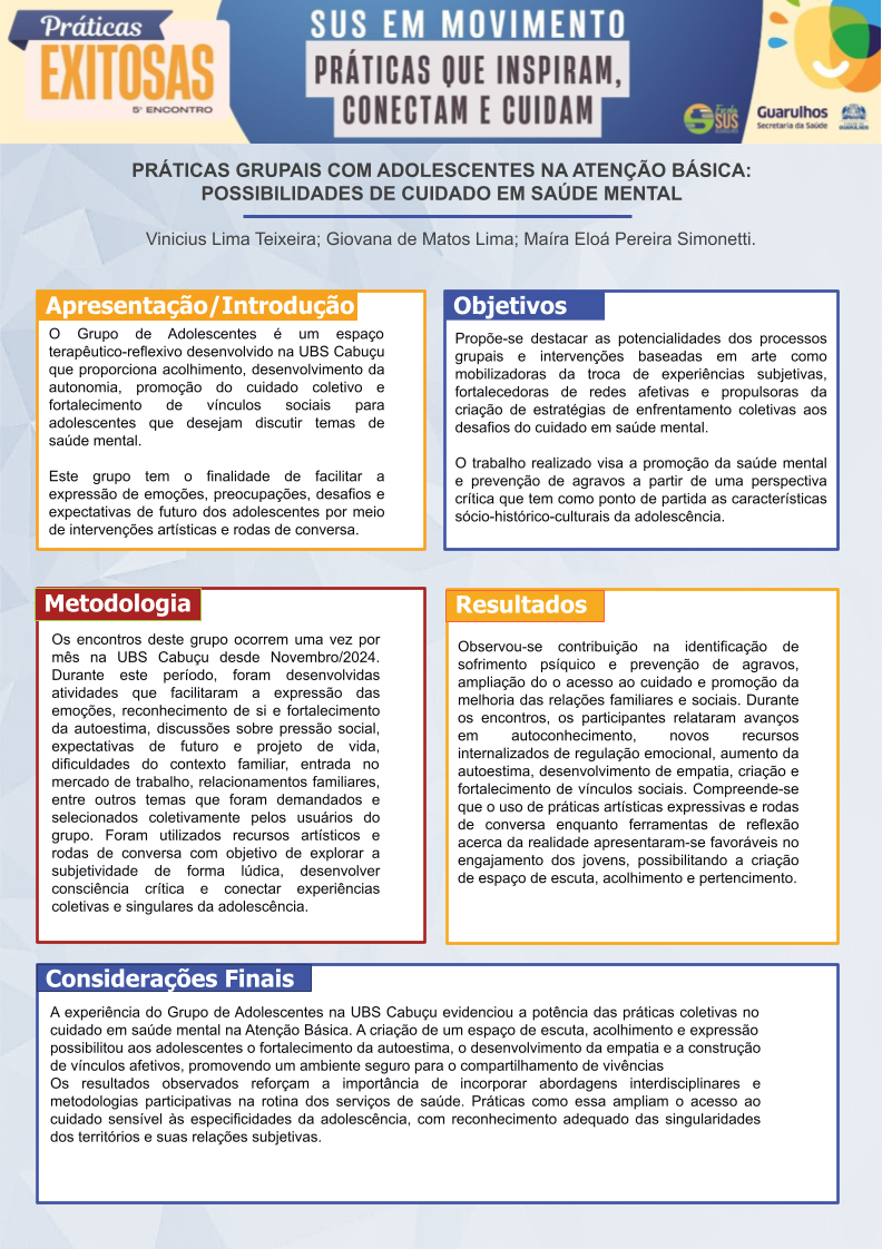 Menção Honrosa Práticas grupais com adolescentes na atenção básica: possibilidades de cuidado em saúde mental |