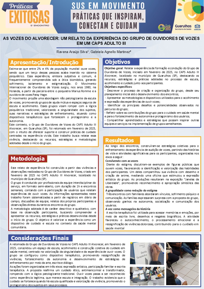 | AS VOZES DO ALVORECER: UM RELATO DA EXPERIÊNCIA DO GRUPO DE OUVIDORES DE VOZES EM UM CAPS ADULTO III | Ravena Araujo Silva; Gabriela Agnello Martinez | |