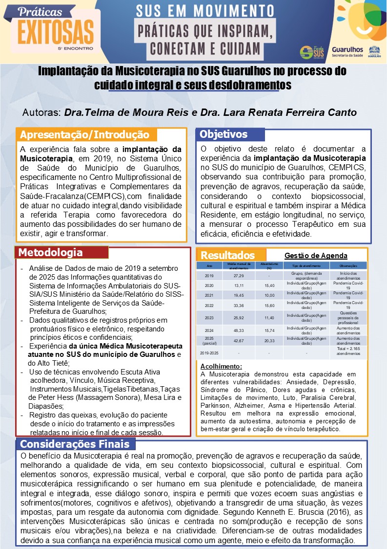 | Implantação da Musicoterapia no SUS Guarulhos no processo do cuidado integral e seus desdobramentos | Telma de Moura Reis; Lara Renata Ferreira Canto | |