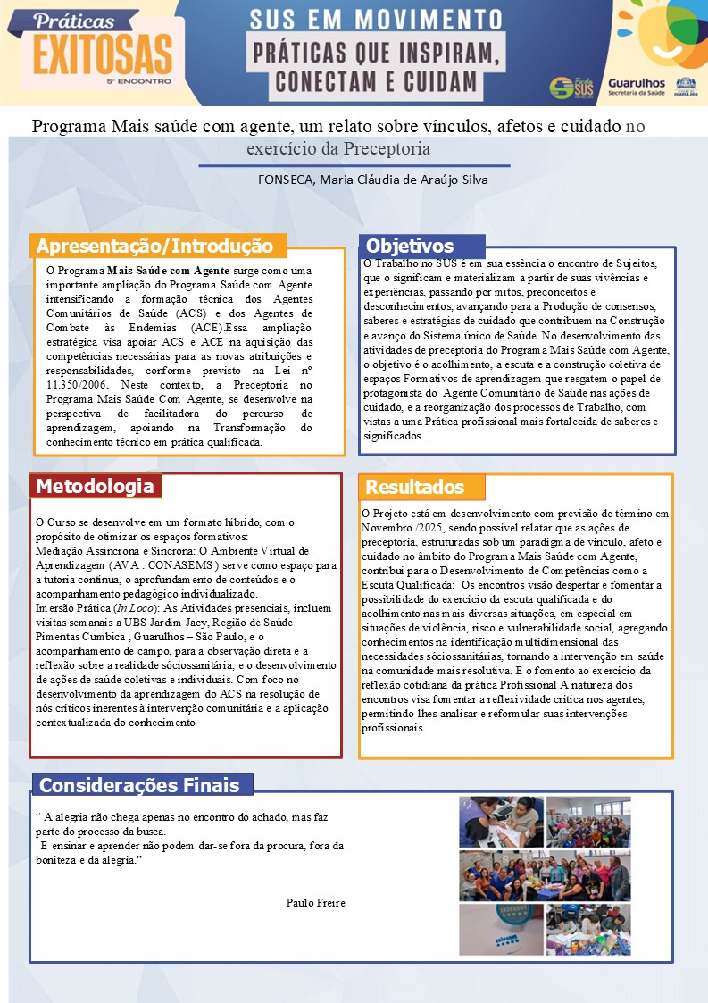 | Programa Mais saúde com Agente, relato sobre vínculos, afetos e cuidado no exercício da Preceptoria | Maria Cláudia de Araújo Silva Fonseca | |