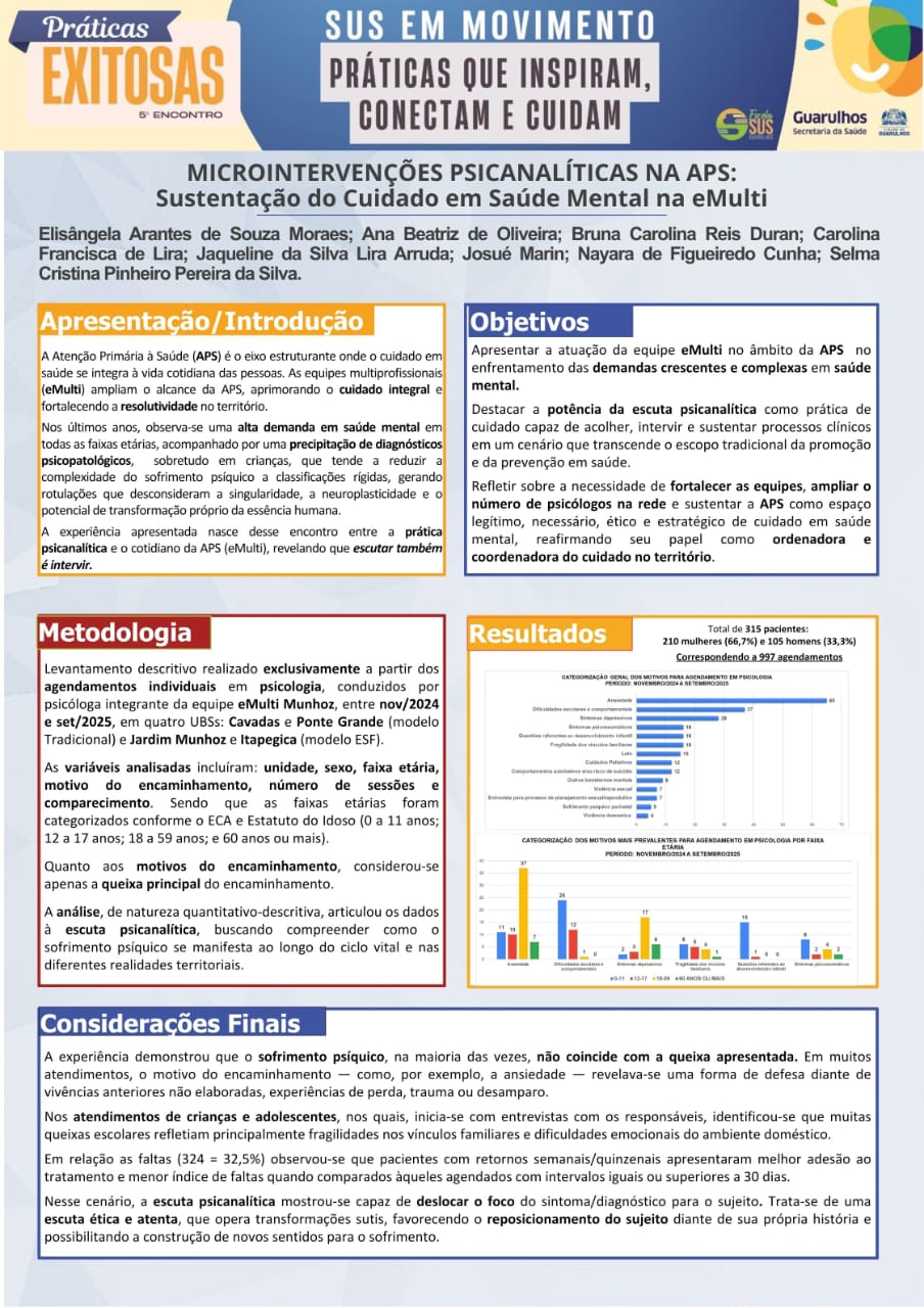 | Microintervenções psicanalíticas na APS: sustentação do cuidado em saúde mental na eMulti | Elisângela Arantes de Souza Moraes; Jaqueline da Silva Lira Arruda, Josué Marin, Bruna , Nayara de Figueiredo Cunha, Ana Beatriz de Oliveira, Selma Cristina Pinheiro Pereira da Silva, Carolina Francisca de Lira | |