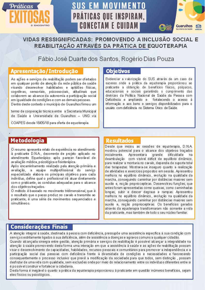 | VIDAS RESSIGNIFICADAS: PROMOVENDO A INCLUSÃO SOCIAL E REABILITAÇÃO ATRAVÉS DA PRÁTICA DE EQUOTERAPIA | Fábio José Duarte dos Santos; Rogério Dias Pouza |