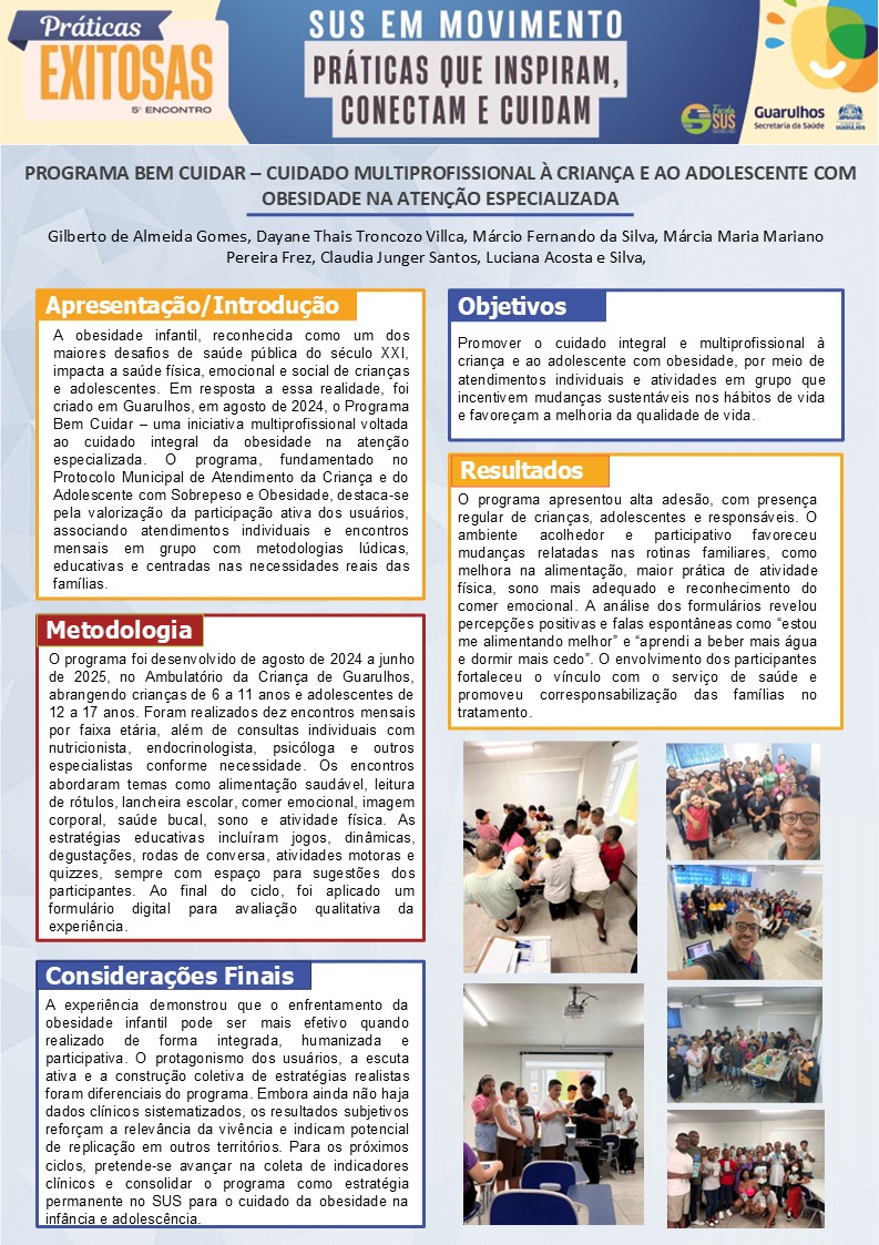 | Programa Bem Cuidar – Cuidado Multiprofissional à Criança e ao Adolescente com Obesidade na AE | Gilberto de Almeida Gomes; Márcio Fernando da Silva; Márcia Maria Mariano Pereira Frez; Claudia Junger Santos; Luciana Acosta e Silva; Dayane Thais Troncozo Villca | |